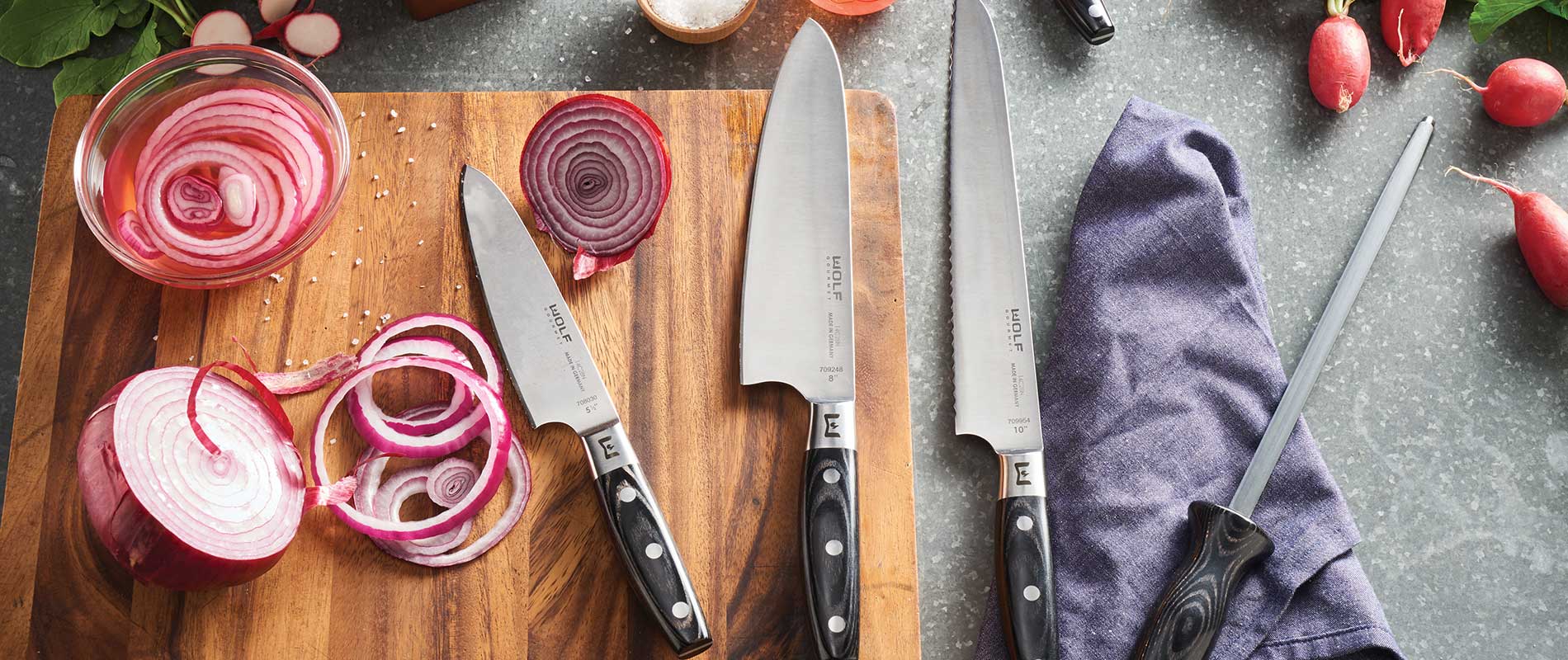 Wolf Gourmet knives are among the sharpest, most durable knives in the world thanks to a blend of high-end materials, thoughtful design and German craftsmanship. Every knife is forged from a single piece of high-carbon stainless steel, which has been proven to maintain an edge over time. Developed with the exacting standards of professional chefs in mind, Wolf Gourmet knives are sure to become your trusted culinary companions.
