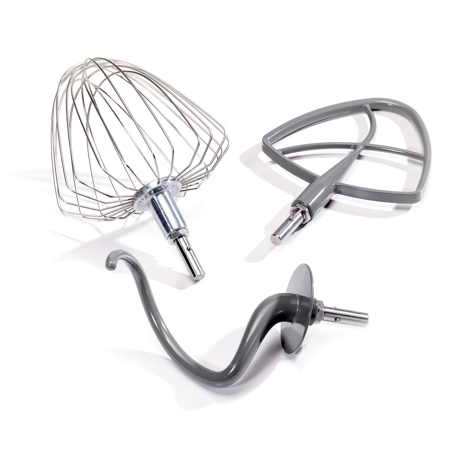 A flat beater, whisk, and dough hook are included, so you can take on any culinary endeavor right away. The splash/pouring shield helps prevent splatters when mixing and adding ingredients.