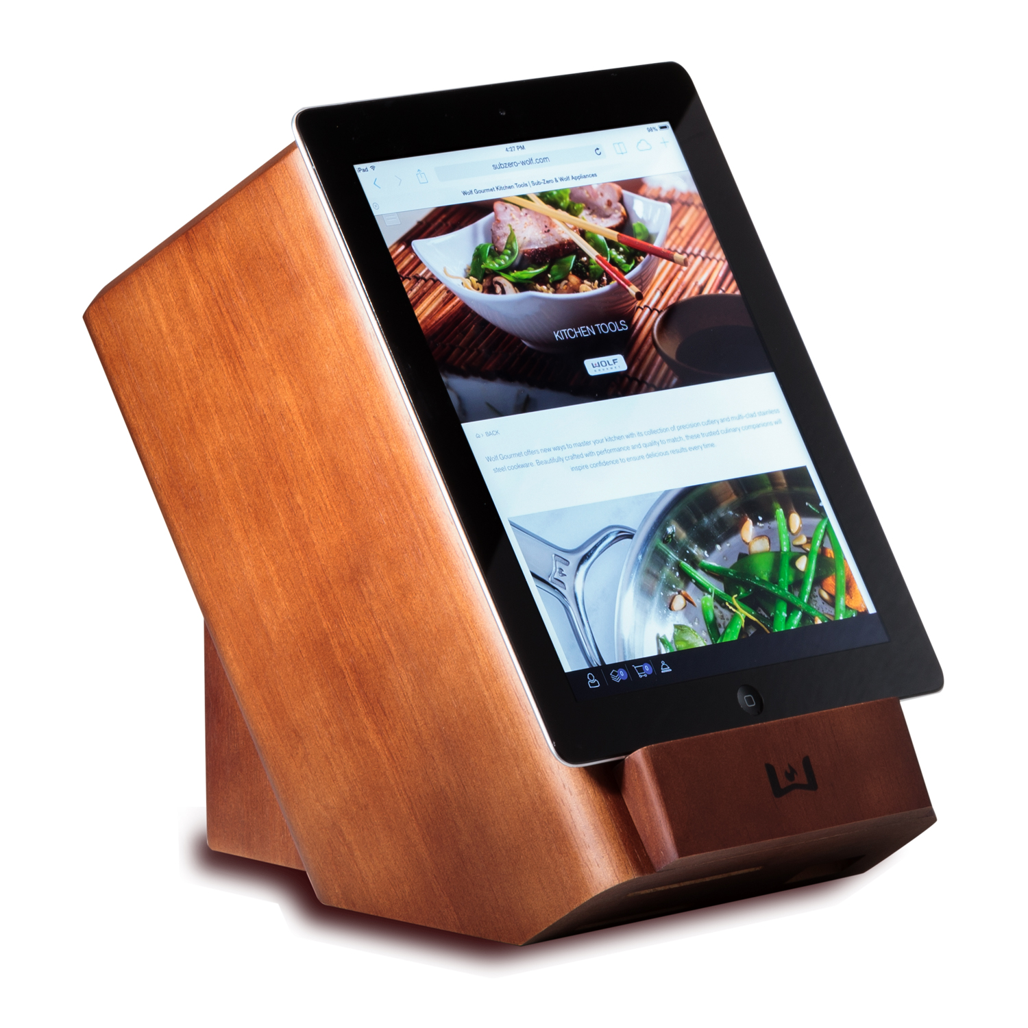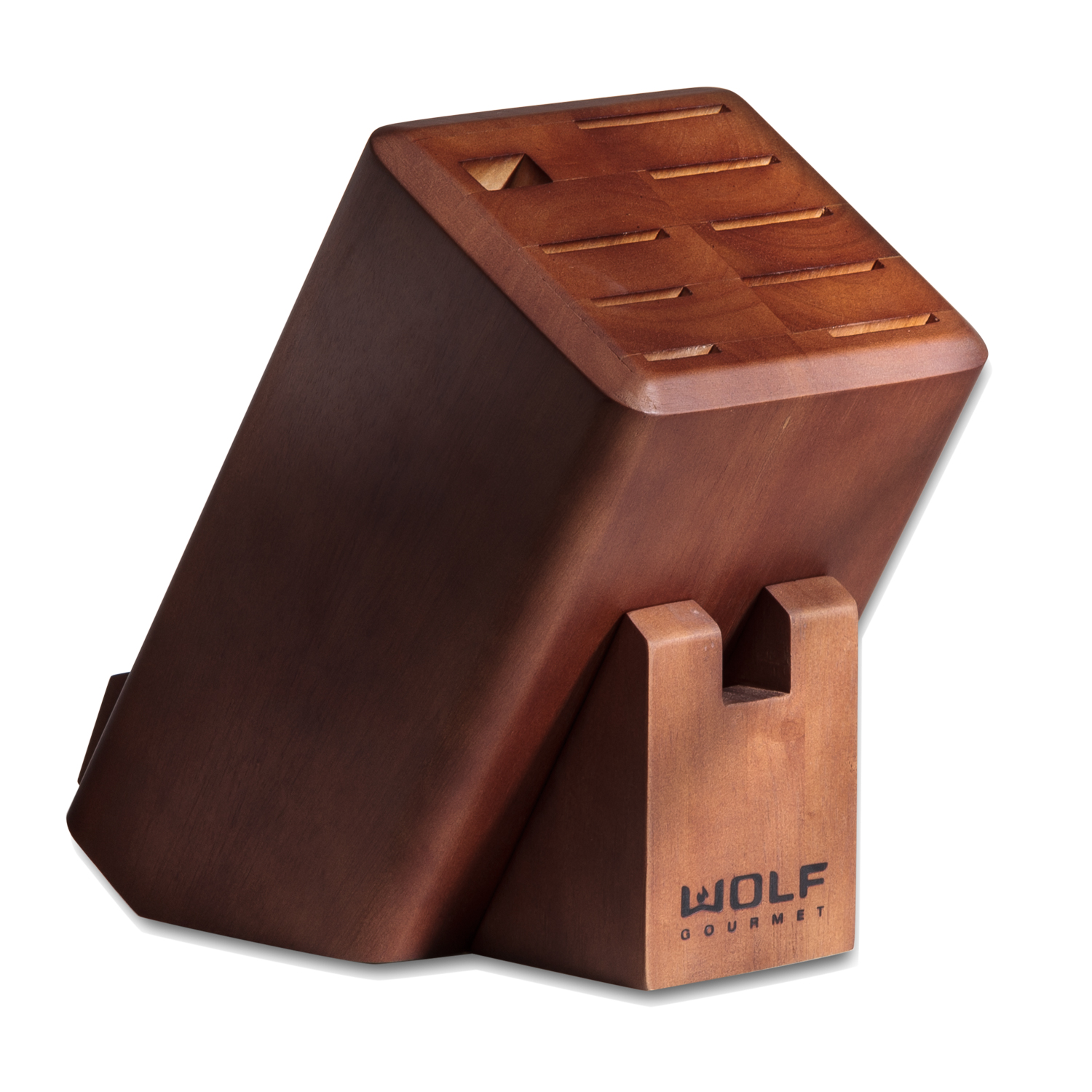 Protect your investment by storing your knives in the Wolf Gourmet knife storage block. Angled hardwood storage block keeps pieces within easy reach and helps protect cutting edges. There is a convenient tablet/book rest on back of block for easy recipe access. It holds eight knives, a honing steel and shears.